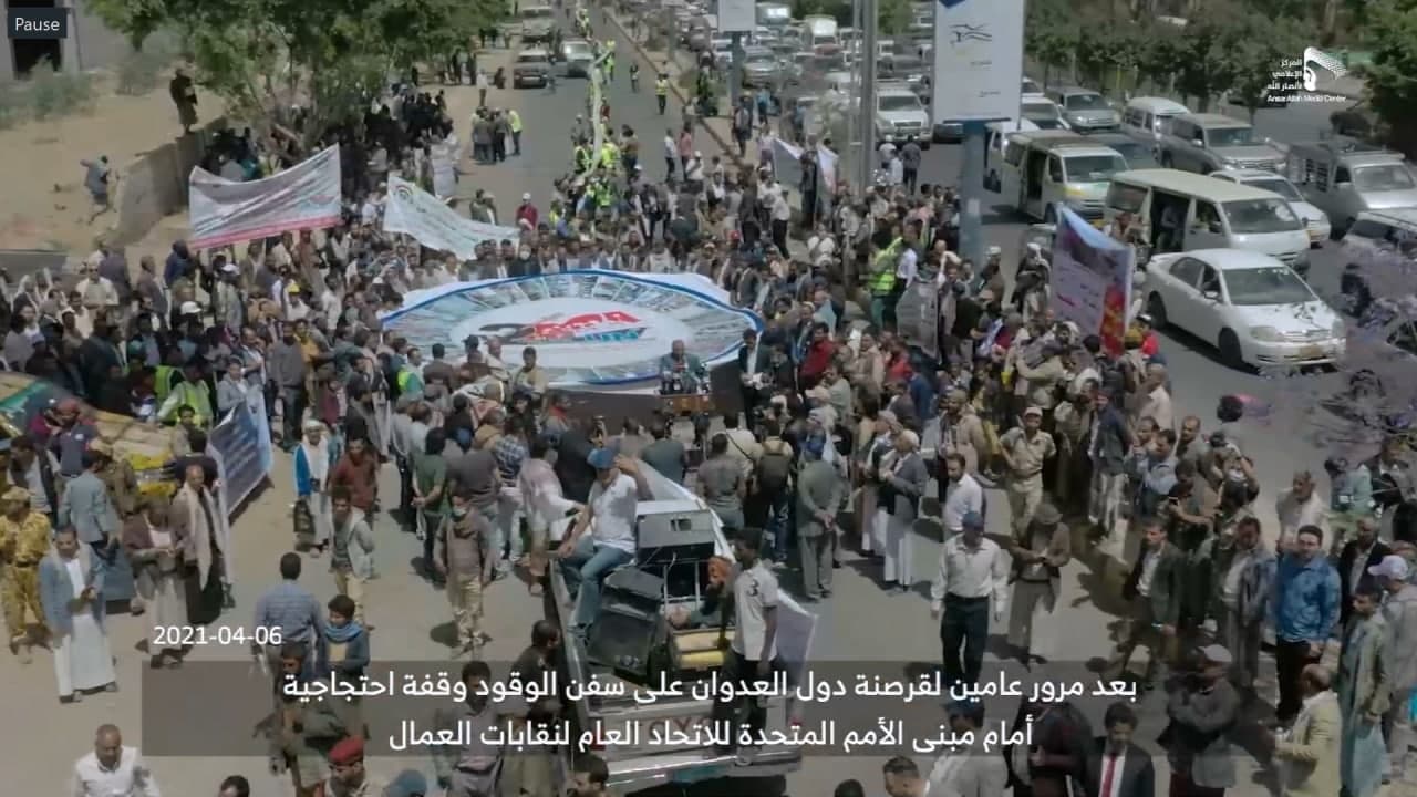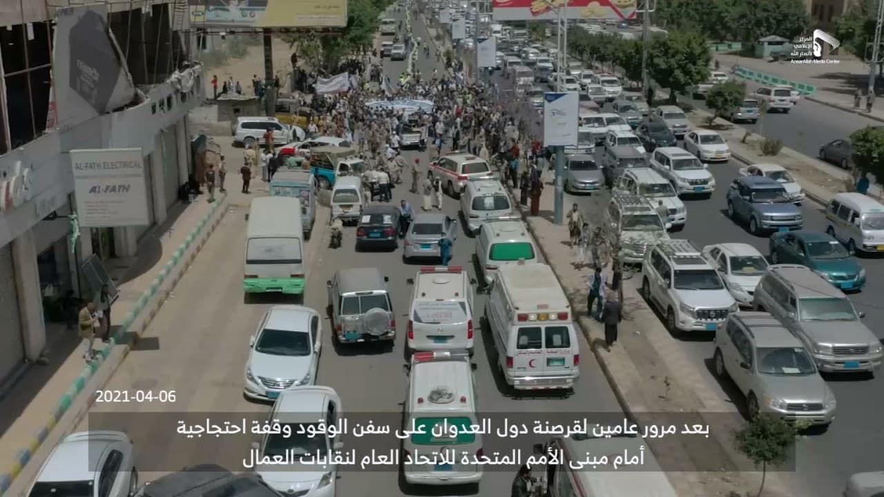 ورفع المشاركون في المسيرة من ممثلي القطاعات الخدمية والنظافة والزراعة، وسيارات الإسعاف الشعارات واللافتات المنددة بالممارسات التعسفية لتحالف العدوان الأمريكي السعودي وأعمال القرصنة على سفن الوقود.