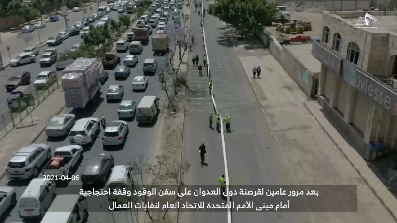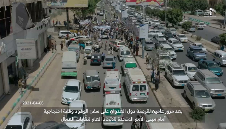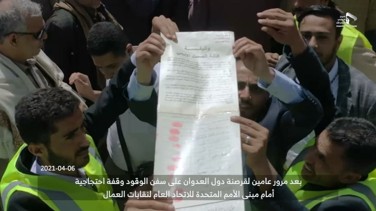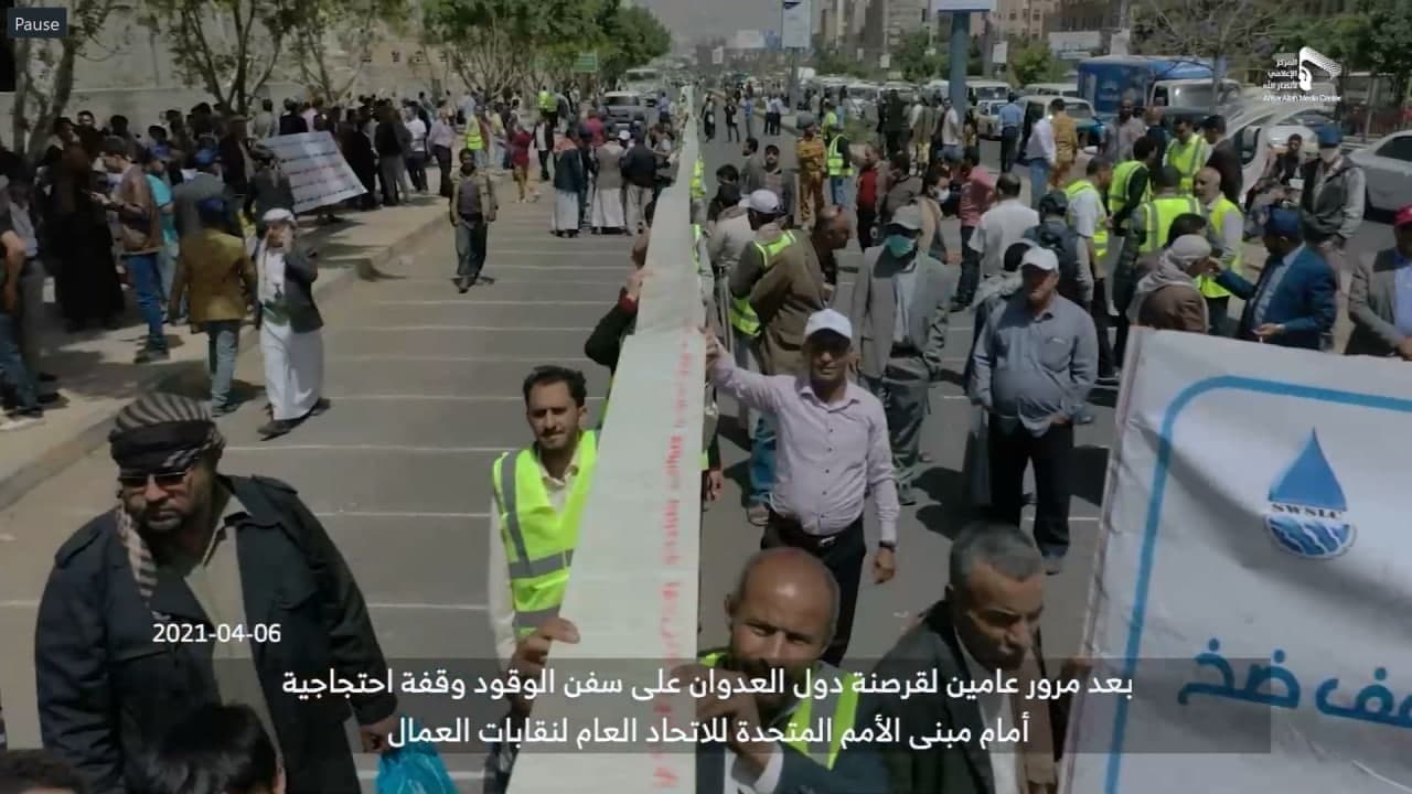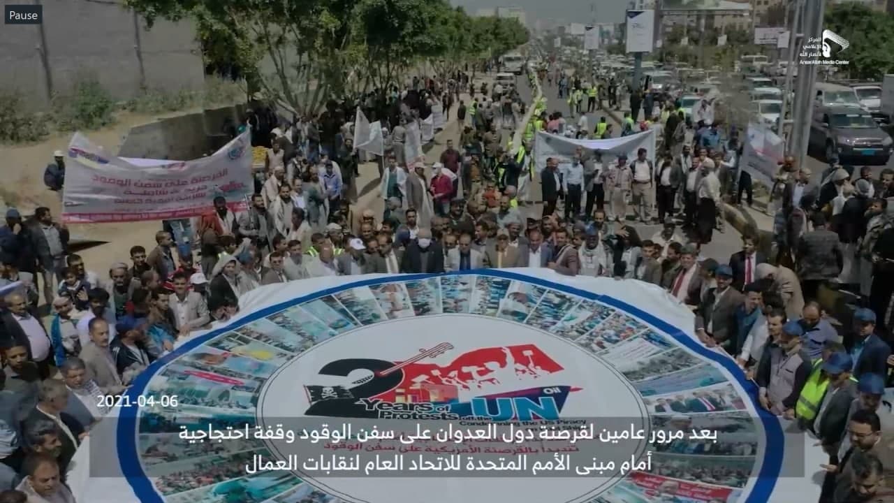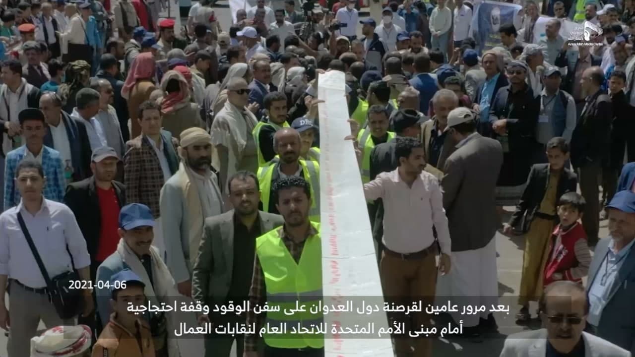نظم الإتحاد العام لنقابات عمّال اليمن اليوم مسيرة حاشدة بالعاصمة صنعاء للتنديد بالصمت الأممي إزاء استمرار أعمال القرصنة البحرية واحتجاز سفن الوقود من قبل قوى تحالف العدوان بقيادة أمريكا.