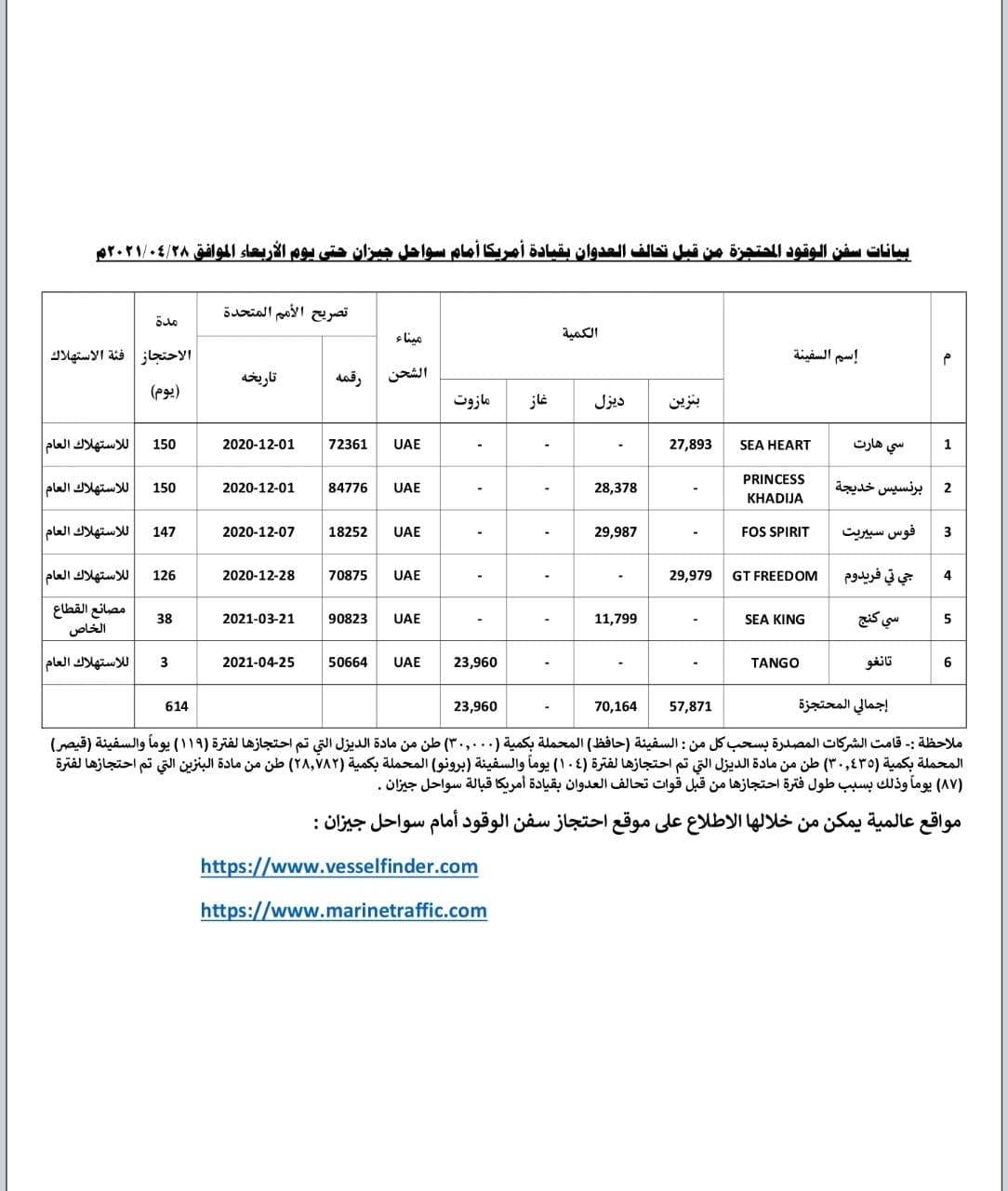ولفت إلى أن سفن المشتقات النفطية المحتجزة من قبل تحالف العدوان الأمريكي السعودي أصبح عددها ست سفن منها سفينة محملة بمادة المازوت وخمس سفن محملة ب (128,035) طن من مادتي البنزين والديزل ولفترات متفاوتة.