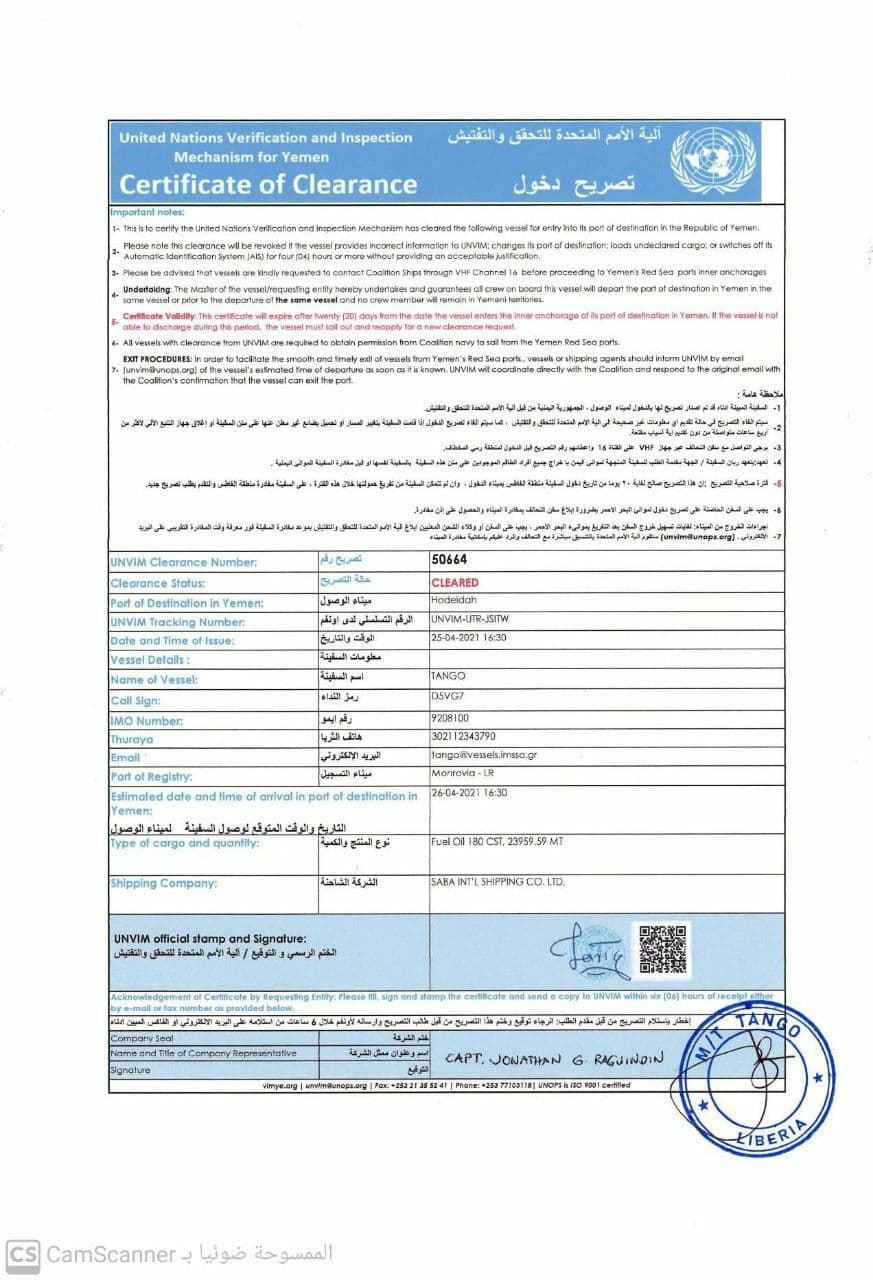 وأوضح الناطق الرسمي للشركة عصام المتوكل، أن السفينة ” تانغو” التي تم منعها من الوصول إلى ميناء الحديدة رغم تفتيشها وحصولها على تصاريح دخول من الأمم المتحدة، تحمل مازوت مخصص لقطاع الكهرباء.