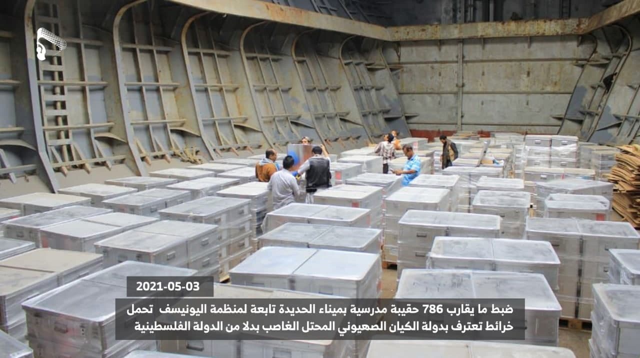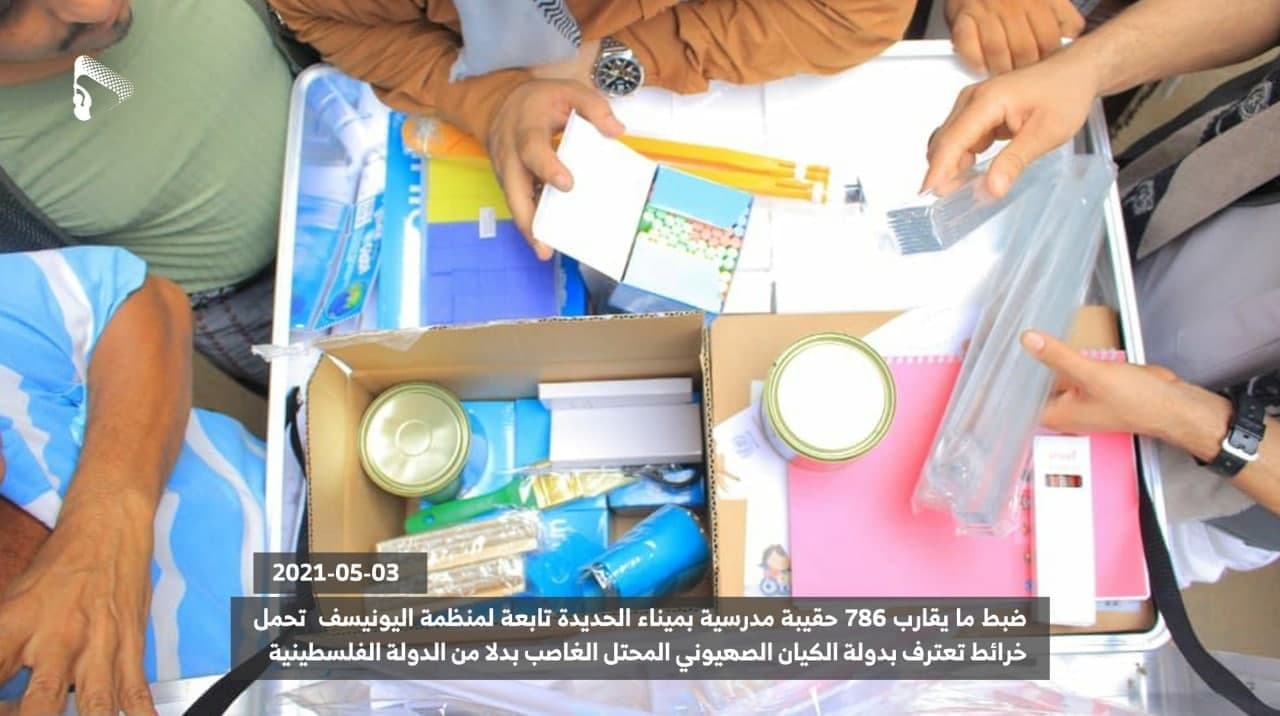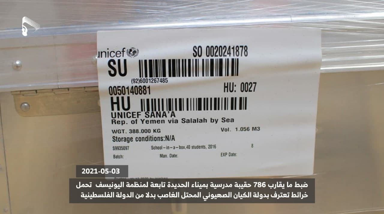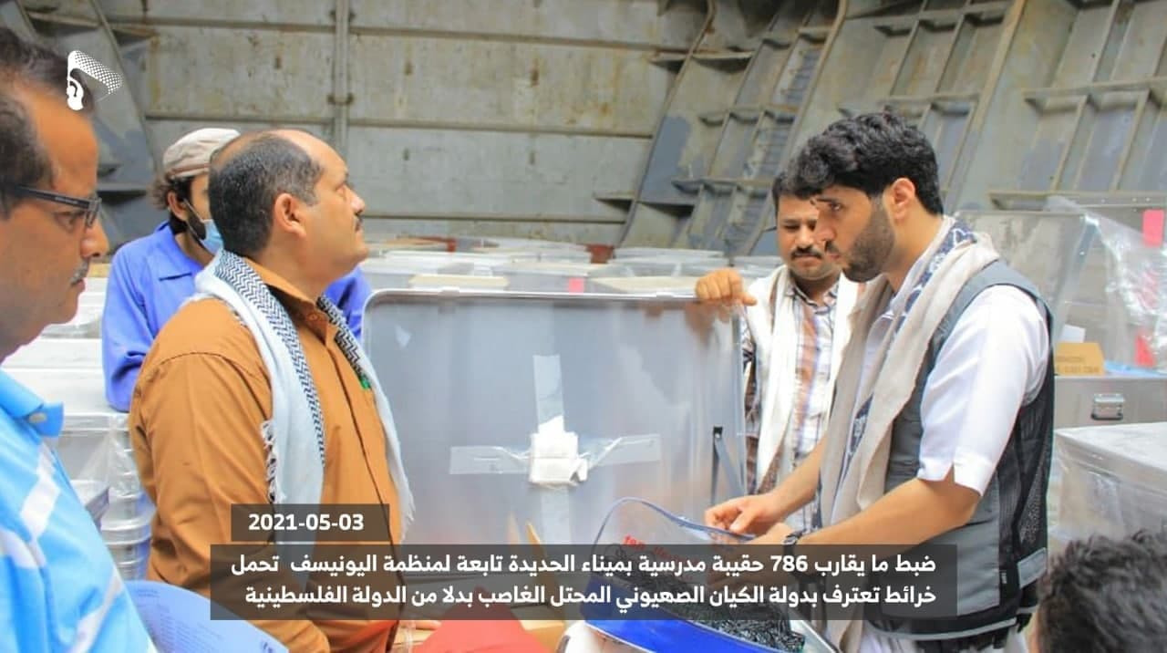 ضبط بميناء الحديدة بحضور مدير عام شرطة محافظة الحديدة العقيد مهدي الكحلاني ومدير عام المجلس الأعلى للشؤون الإنسانية فرع الحديدة الأستاذ جابر الرازحي ما يقارب 786 حقيبة مدرسية تتبع منظمة اليونيسف كانت تنوي توزيعها لطلاب وطالبات محافظة الحديدة.