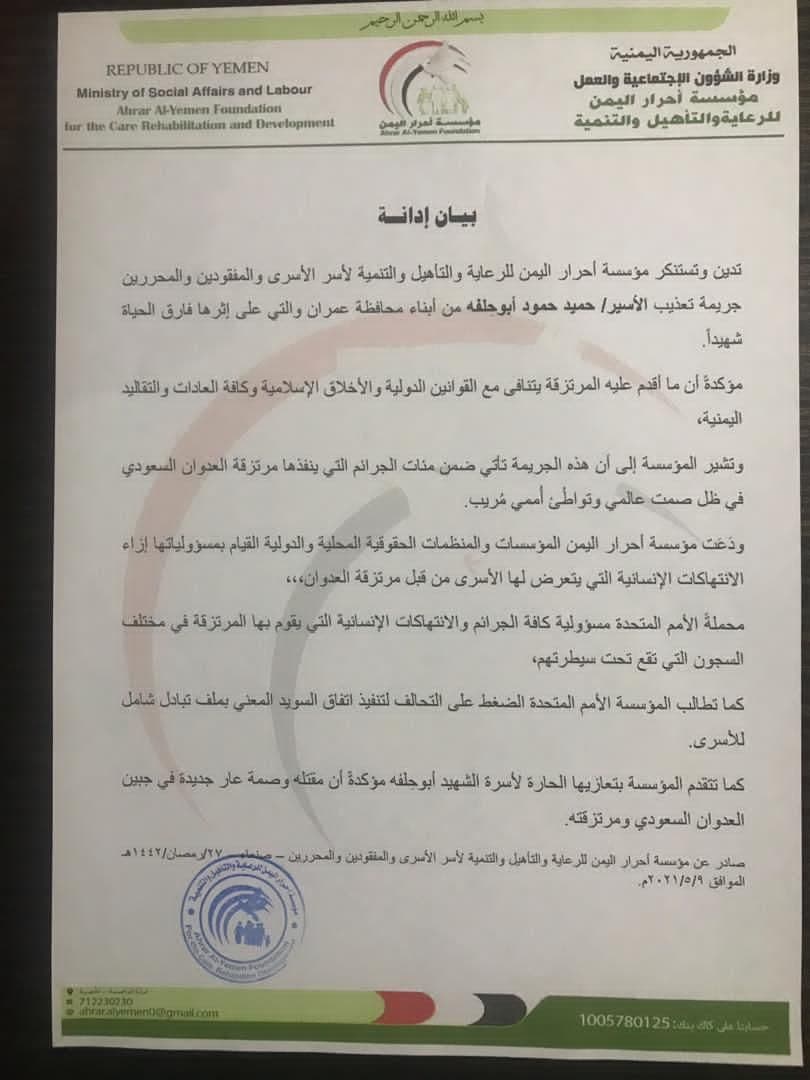 أدانت مؤسسة أحرار اليمن لرعاية وتأهيل وتنمية أسر الأسرى والمفقودين جريمة تعذيب الأسير حميد حمود أبو حلفه ما أدى إلى استشهاده.