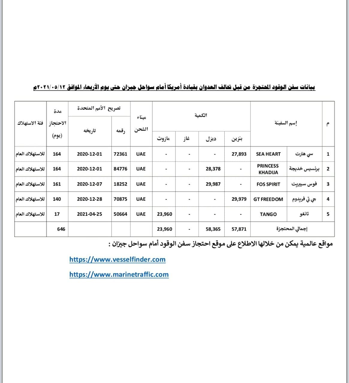 *مرفق كشف تفصيلي بالكميات والسفن المحتجزة.