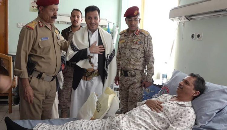 تفقد وزير الصحة العامة والسكان الدكتور طه المتوكل و مدير دائرة الاستخبارات العسكرية العميد الركن علي أبو حليقة أحوال الجرحى من أبناء الجيش واللجان الشعبية بالمستشفى العسكري بصنعاء .