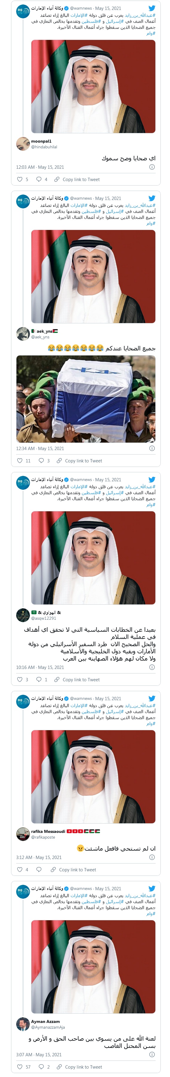 وأثارت التصريحات جدلا كبيرا على مواقع التواصل الاجتماعي، حيث انتقد المتابعون ميل أبو ظبي في البيان الى المساواة بين الضحية والجلاد، وامتناعها عن دعم ومناصرة الفلسطينيين الذين يتعرضون للقصف الإسرائيلي المتواصل في قطاع غزة، واعتداءات المستوطنين وجيش الاحتلال الإسرائيلي في الضفة الغربية والمسجد الأقصى، بالإضافة الى التهجير من حي الشيخ جراح في القدس المحتلة.