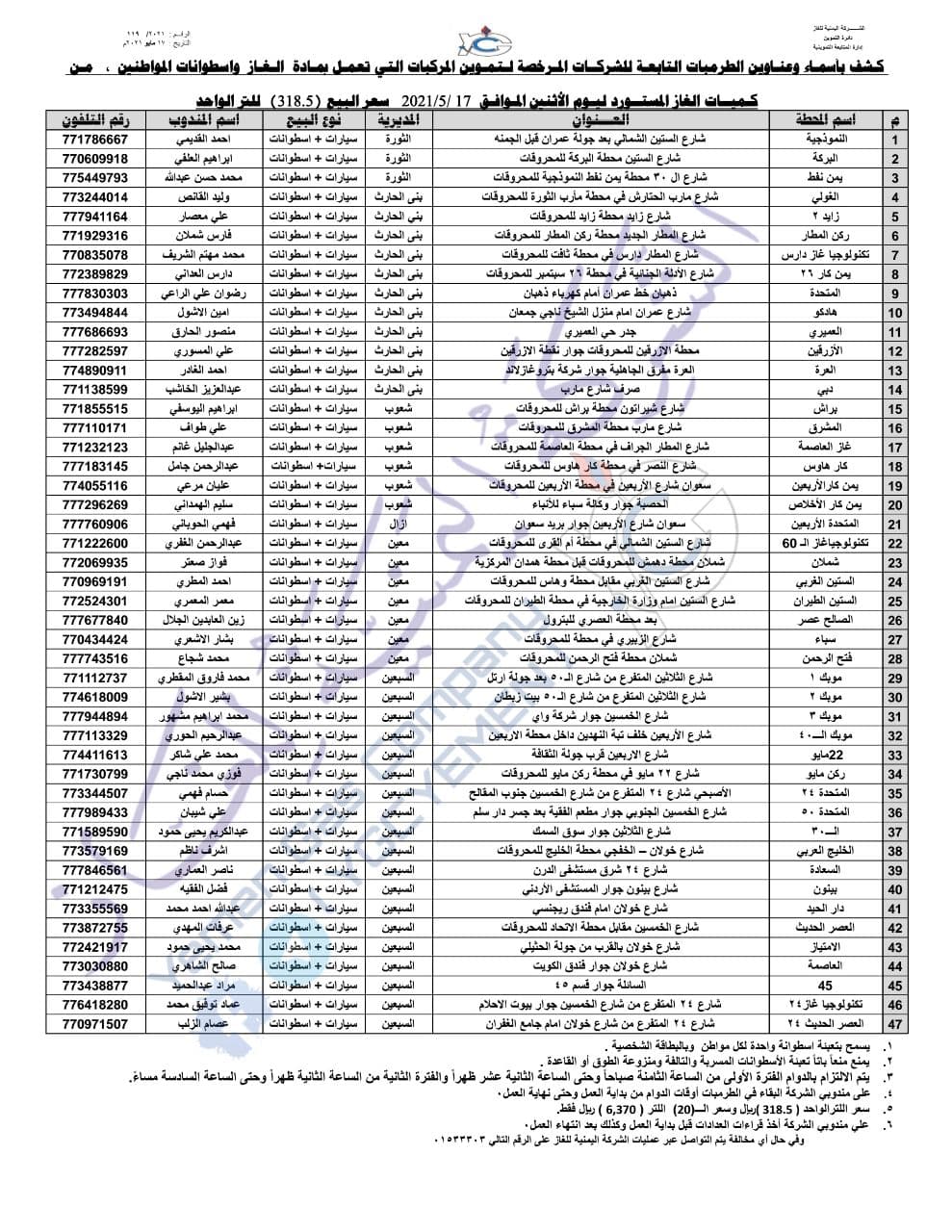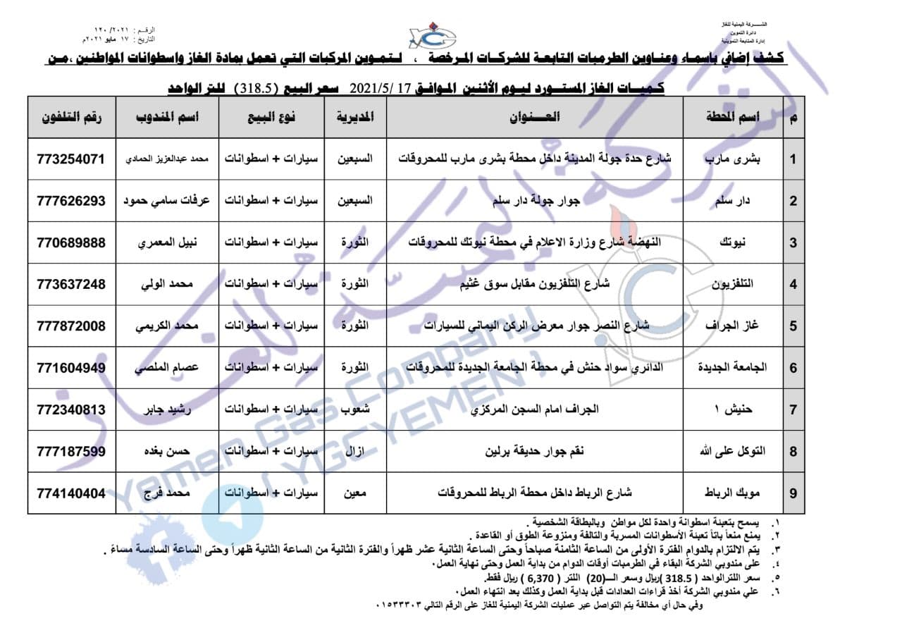 كما نشرت الشركة كشوفات بأسماء وعناوين المحطات المرخصة لتعبئة المركبات وأسطوانات الغاز المنزلي للمواطنين بأمانة العاصمة صنعاء ليوم الإثنين الموافق 17 مايو 2021م.