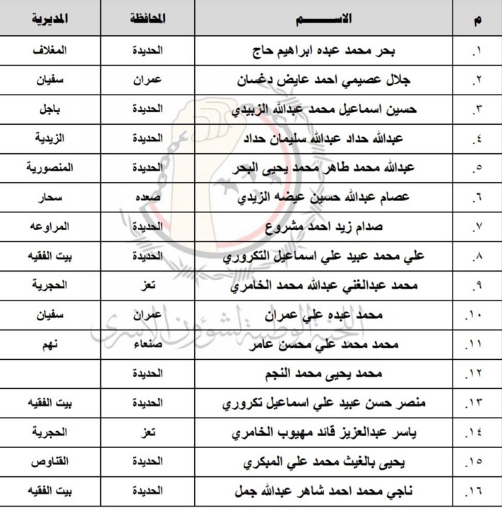 أعلنت اللجنة الوطنية لشؤون الأسرى، مساء الثلاثاء، عن تحرير 16 أسيراً من أسرى الجيش واللجان الشعبية في عملية تبادل محلية بجبهة مأرب.