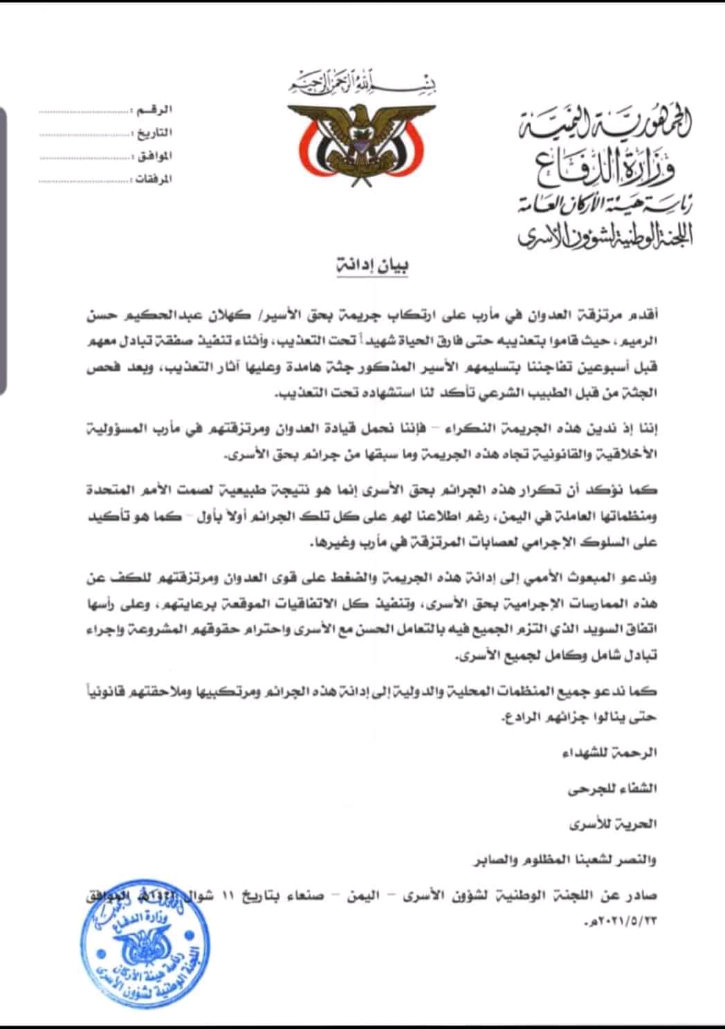 أدانت اللجنة الوطنية لشؤون الأسرى جريمة تعذيب مرتزقة العدوان السعودي في مأرب بحق الأسير كهلان عبدالحكيم حسن الرميم، حتى فارق الحياة.