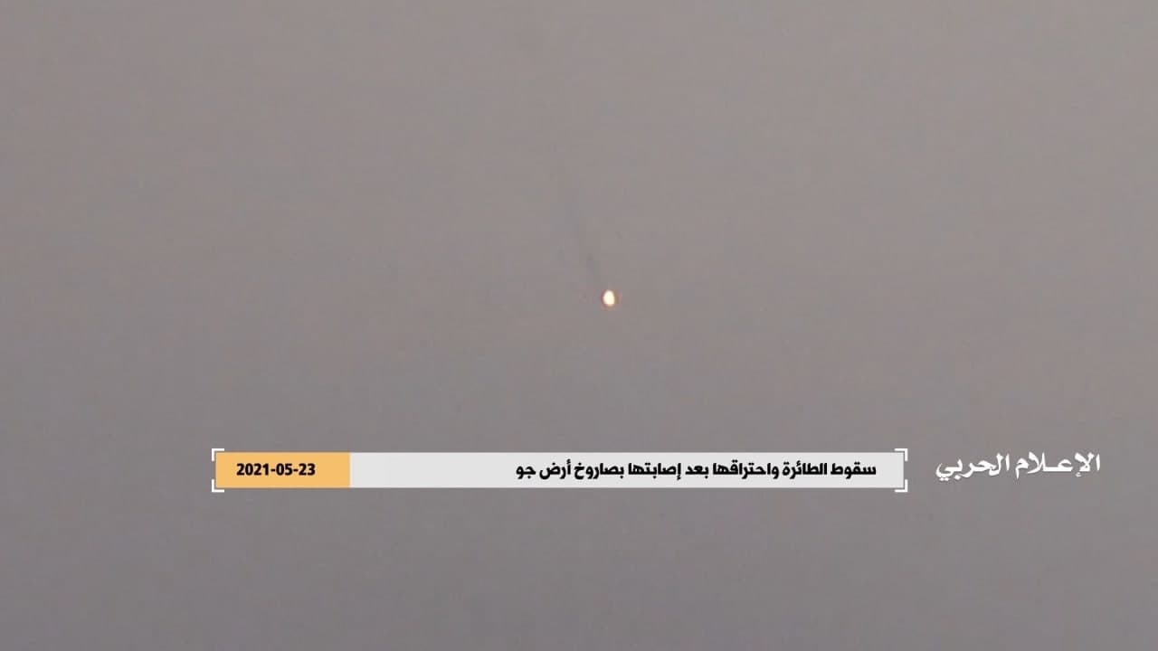 وأظهرت المشاهد الحرارية لحظات إصابة الطائرة واحتراقها وسقوطها -بفضل الله- بصاروخ أرض جو، لم يتم الكشف عنه بعد.