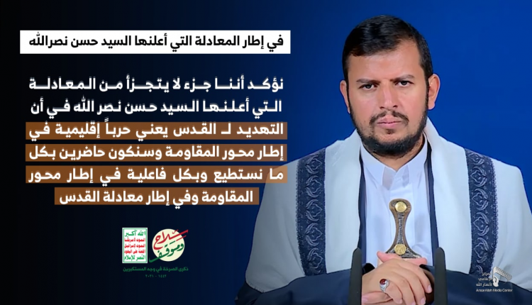 وقال السيد عبدالملك الحوثي في كلمة متلفزة بمناسبة الذكرى السنوية للصرخة في وجه المستكبرين: “نؤكد أننا جزء لا يتجزأ من المعادلة التي أعلنها السيد نصرالله، في أن التهديد للقدس يعني حرباً إقليمية في إطار محور المقاومة، وسنكون حاضرين بكل ما نستطيع وبكل فاعلية في إطار محور المقاومة وفي إطار معادلة القدس”.