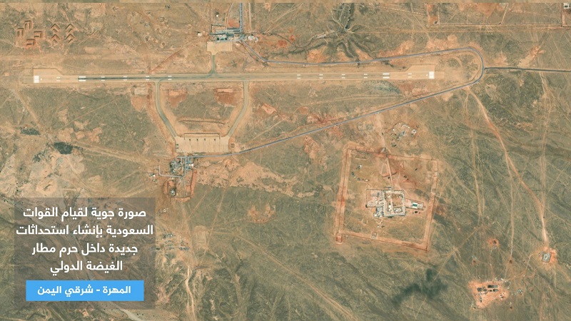 وفي جديد الاحداث نشر ناشطون صور جوية تظهر حجم الاستحداثات والانشاءات الكبيرة التي قامت بها القوات السعودية في مطار الغيضة الدولي بمحافظة المهرة الحدودية مع سلطنة عمان.