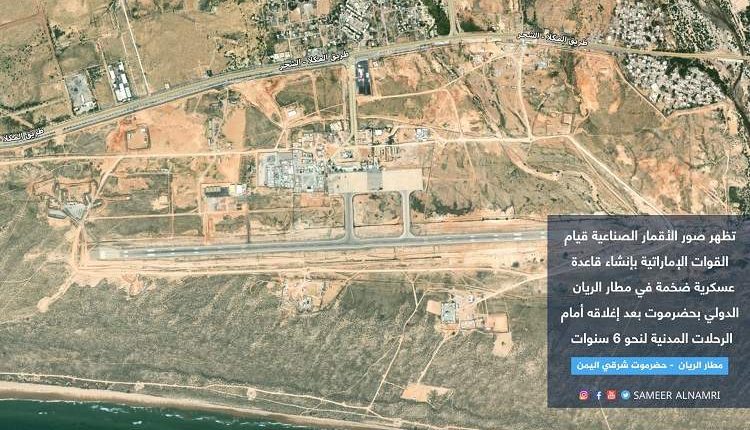 وقالت قناة “الجزيرة” إن الإمارات تنشىء قاعدة عسكرية داخل حرم مطار الريان الدولي بحضرموت بعد أن قامت بإغلاقه أمام الرحلات المدنية لنحو 6 سنوات.