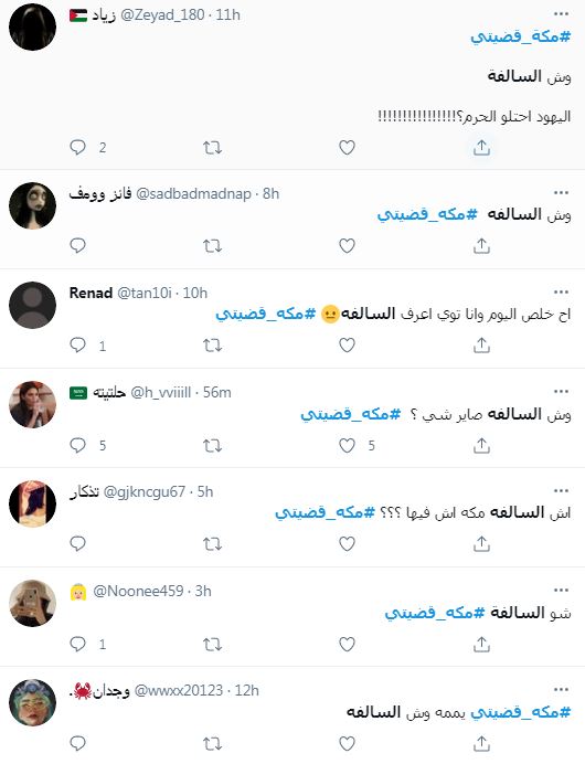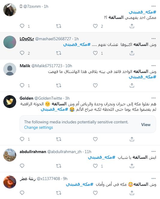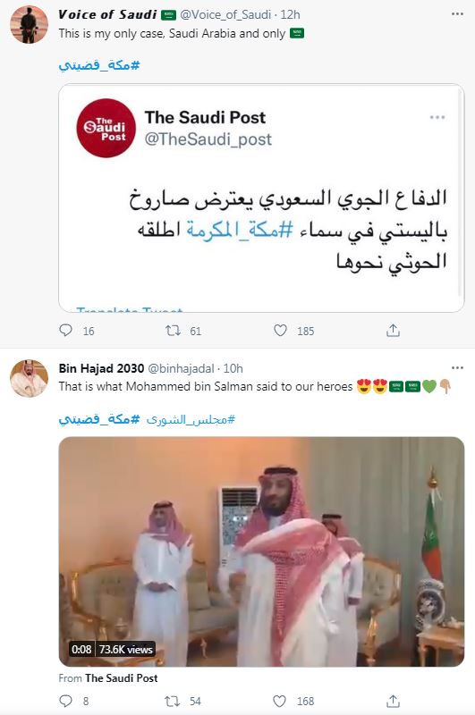 أطلق سعوديون على تويتر وسماً حمل شعار #مكه_قضيتي زاعمين من خلاله قصف سلاح الجو اليمني المسير مدينة مكة المكرمة. الخبر الذي كشف زيف الاعلام السعودي على مواقع التواصل الاجتماعي لقي استهزاء رواد تويتر بالإدعاءات السعودية والافتراءات المكررة التي تستهدف اليمن وشعبها وقواتها العسكرية التي تخوض معركة الدفاع عن اليمن بكرامة وعزة.