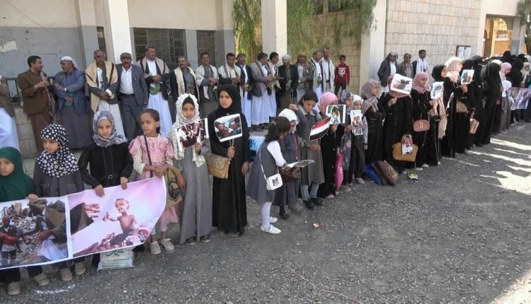 ورفع الاطفال صور الأطفال الذين استشهدوا وأصيبوا جراء استهداف طيران العدوان الأمريكي السعودي على اليمن ولافتات منددة بالمواقف المخزية للأمم المتحدة وأمينها العام، تجاه ما يتعرض له أطفال اليمن من جرائم وانتهاكات من قبل تحالف العدوان.