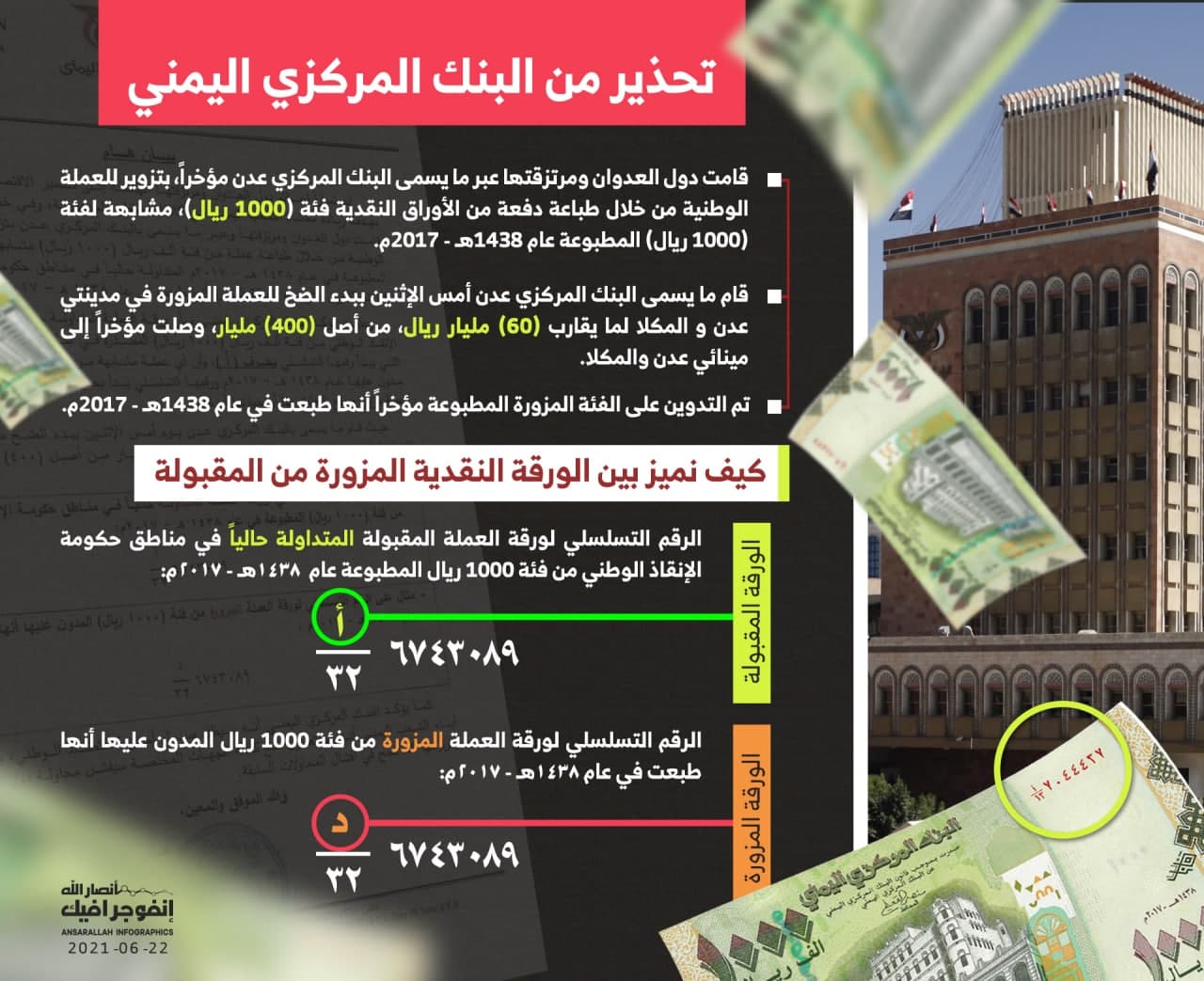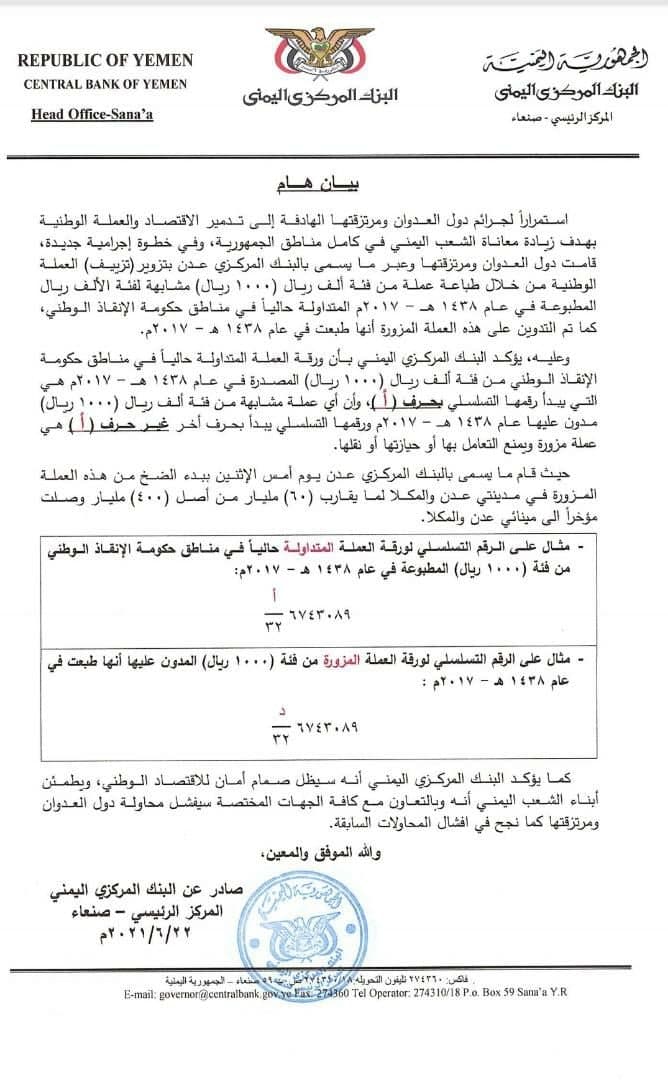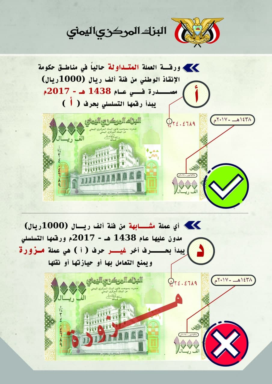 وعليــه، يؤكد البنك المركزي اليمني بأن ورقة العملة المتداولة حالياً في مناطق حكومة الإنقاذ الوطني من فئة ألف ريال (1000 ريال) المصدرة في عام 1438 هـ – 2017م هي التي يبدأ رقمها التسلسلي بحرف ( أ)، وأن أي عملة مشابهة من فئة ألف ريال (1000 ريال) مدون عليها عام 1438 هـ – 2017م ورقمها التسلسلي يبدأ بحرف أخر غير حرف ( أ) هي عملة مزورة ويمنع التعامل بها أو حيازتها أو نقلها.