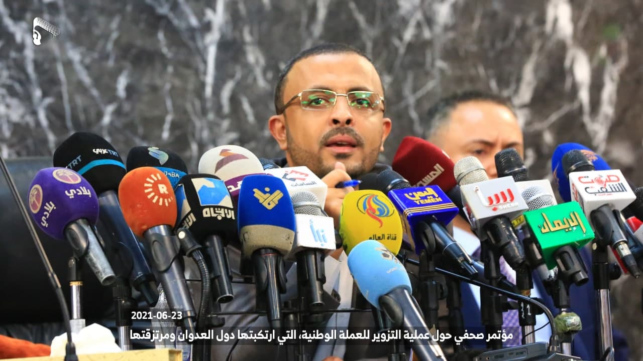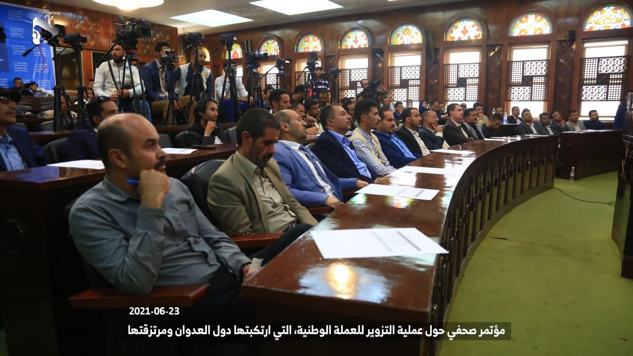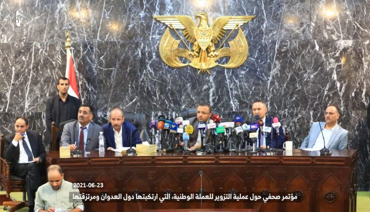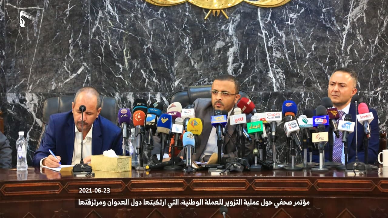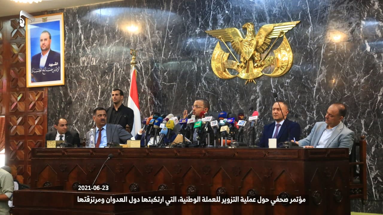 استمراراً لجرائم دول العدوان ومرتزقتها الهادفة إلى تدمير الاقتصاد والعملة الوطنية بهدف زيادة معاناة الشعب اليمني في كامل مناطق الجمهورية، وفي خطوة إجرامية جديدة، قامت دول العدوان ومرتزقتها وعبر ما يسمى بالبنك المركزي عدن بتزوير(تزييف) العملة الوطنية من خلال طباعة عملة من فئة ألف ريال (1000 ريال) مشابهة لفئة الألف ريال المطبوعة في عام 1438 هـ – 2017م المتداولة حالياً في مناطق حكومة الإنقاذ الوطني، كما تم التدوين على هذه العملة المزورة أنها طبعت في عام 1438 هـ – 2017م.