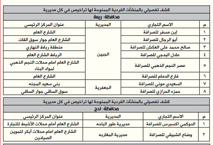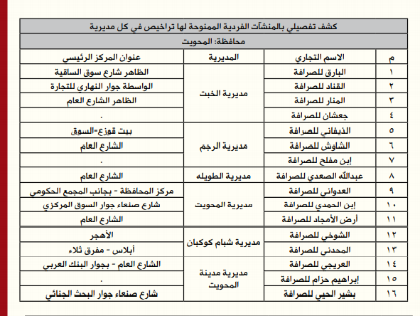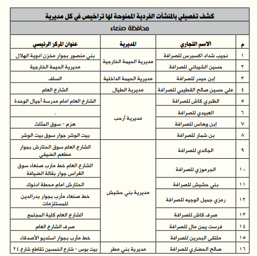 أعلن البنك المركزي اليمني (المركز الرئيسي- صنعاء) قائمة أسماء وعناوين الصرافين المرخص لهم بمزاولة نشاط أعمال الصرافة للعام 2021م حتى تاريخه، وذلك إمتثالاً لأحكام القانون رقم (19) لسنة 1995م المعدل بموجب القرار الجمهوري بالقانون رقم (15) لسنة 1996م بشأن تنظيـم أعمال الصرافـة.