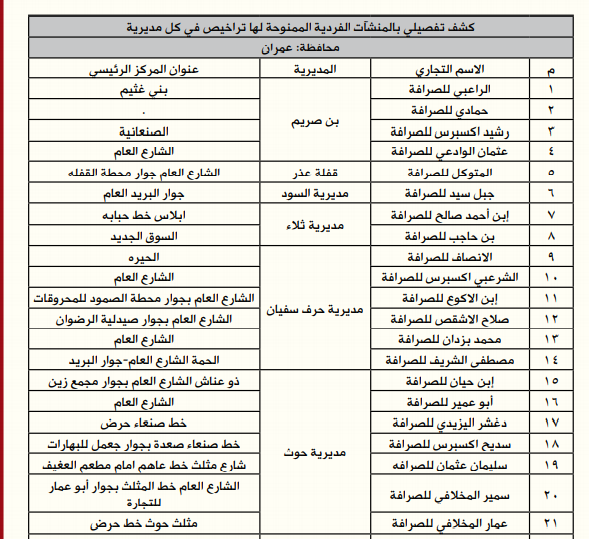 *كشف تفصيلي بشركات الصرافة كلا على حدة المرخصة لفروعها في المحافظات والمديريات: