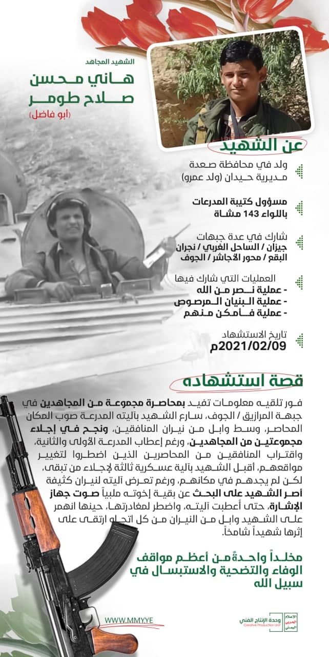 ليقوم بعدها الشهيد المجاهد أبو فاضل طومر باختراق خطوط مرتزقة العدوان بمدرعة والوصول إلى رفاقه المجاهدين، تحت وابل كثيف من النيران انهال عليه من ثلاث جهات وبوصول المدرعة وإن معطوبة أنجز سائقها البطل الفصل الأول من المهمة المستحيلة.
