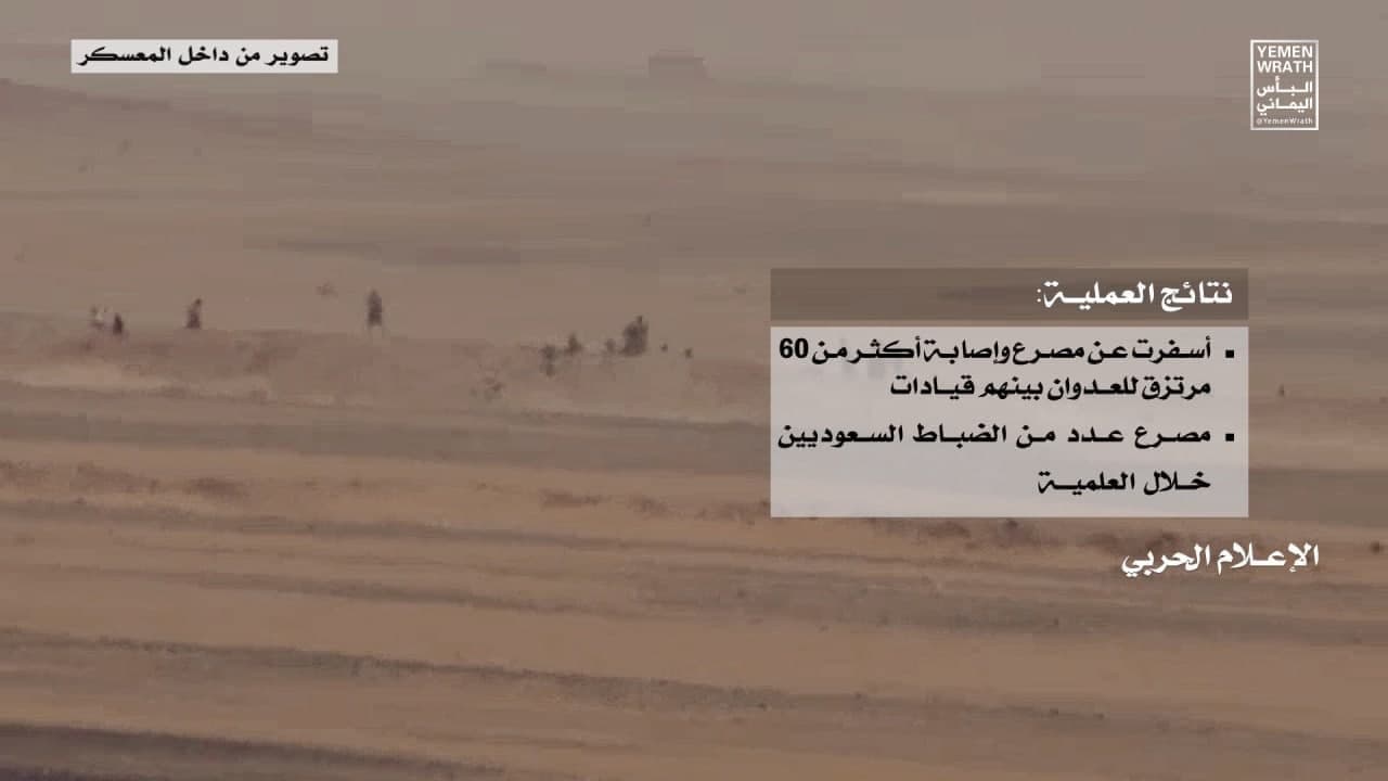 وكان متحدث القوات المسلحة العميد يحيى سريع، أكد الخميس الماضي، أن العملية أسفرت عن مصرع وإصابة أكثر من 60 من مرتزقة العدوان بينهم قادة، بالإضافة إلى مصرع عدد من الضباط السعوديين.