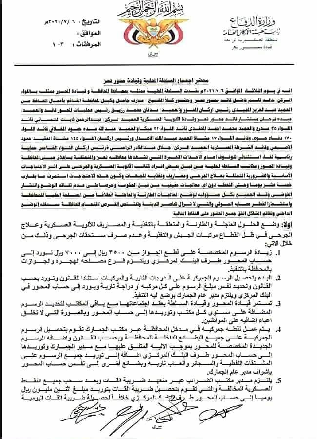 كما كشفت وثائق حصل “يمني برس” على نسخة منها، تتضمن محضر الإجتماع الذي أقرت فيه سلطات المرتزقة في تعز منتصف الأسبوع الماضي، رفع رسوم قطع جوازات السفر بنسبة 100% وعمل نقاط جمركية في مداخل المحافظة لتحصيل الجمارك والجبايات على كل ما يدخل المدينة ومناطق سيطرتهم، وكذلك تحصيل ضريبة القات وتوريد مليونين ريال يومياً لصالح قيادة المحور التابع للمرتزقة في تعز.
