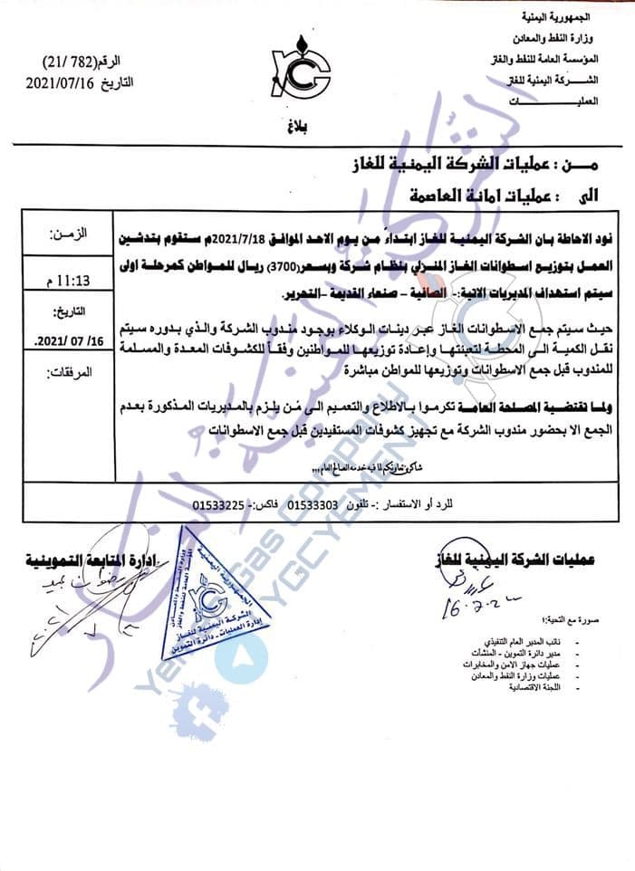 شركة الغاز تزف خبراً ساراً لجميع المواطنين في العاصمة صنعاء وتعلن عن نظام جديد بدلاً عن عقال الحارات وسيتم بيع أسطوانة الغاز المنزلي بهذا السعر إبتداءً من يوم غد؟