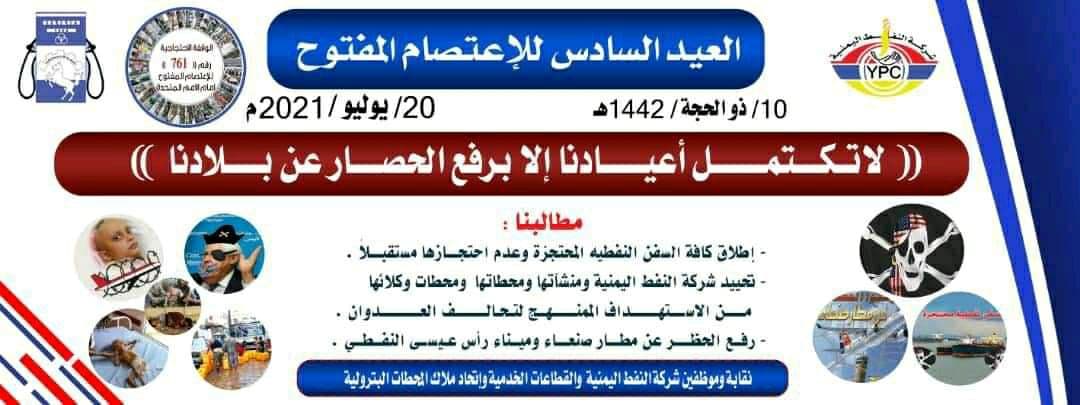 وقالت الشركة في بيان مساء الإثنين، إن الوقفة الإحتجاجية التي ستنظمها في العيد السادس للإعتصام المفتوح أمام مكتب الأمم المتحدة بصنعاء تحت شعار “لا تكتمل أعيادنا إلا برفع الحصار عن بلادنا“.. للمطالبة، بإطلاق كافة السفن النفطية المحتجزة، وضمان عدم احتجاز السفن النفطية مستقبلاً، وتحييد شركة النفط ومنشآتها ومحطاتها ومحطات وكلائها، ورفع الحظر عن ميناء رأس عيسى ومطار صنعاء الدولي، والتنديد بالتواطؤ الأممي المشين.