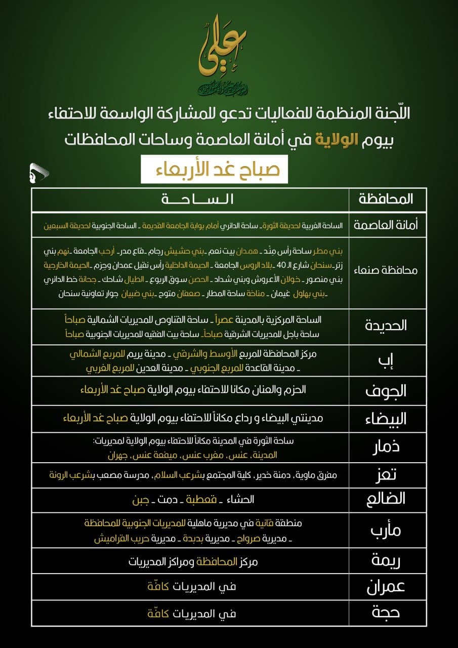 وفي محافظة عمران دعت اللجنة المنظمة للمشاركة الواسعة في إحياء يوم الولاية يوم الأربعاء في المديريات كافّة.
