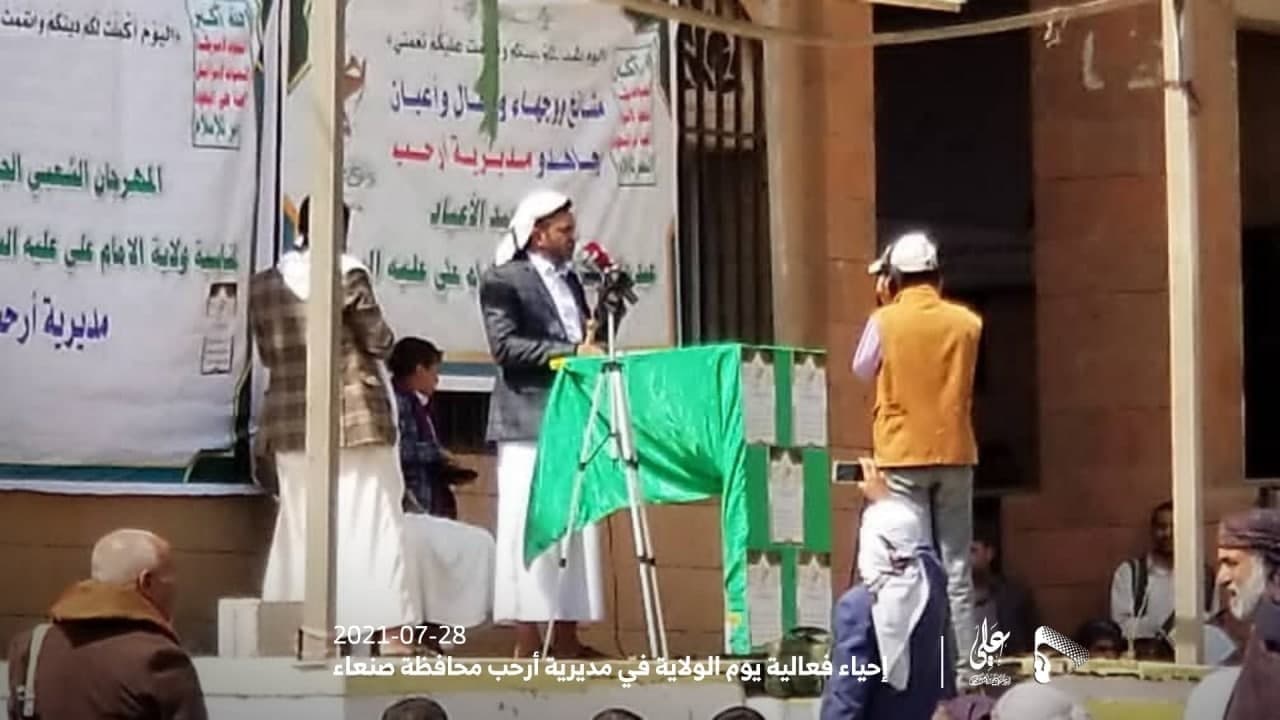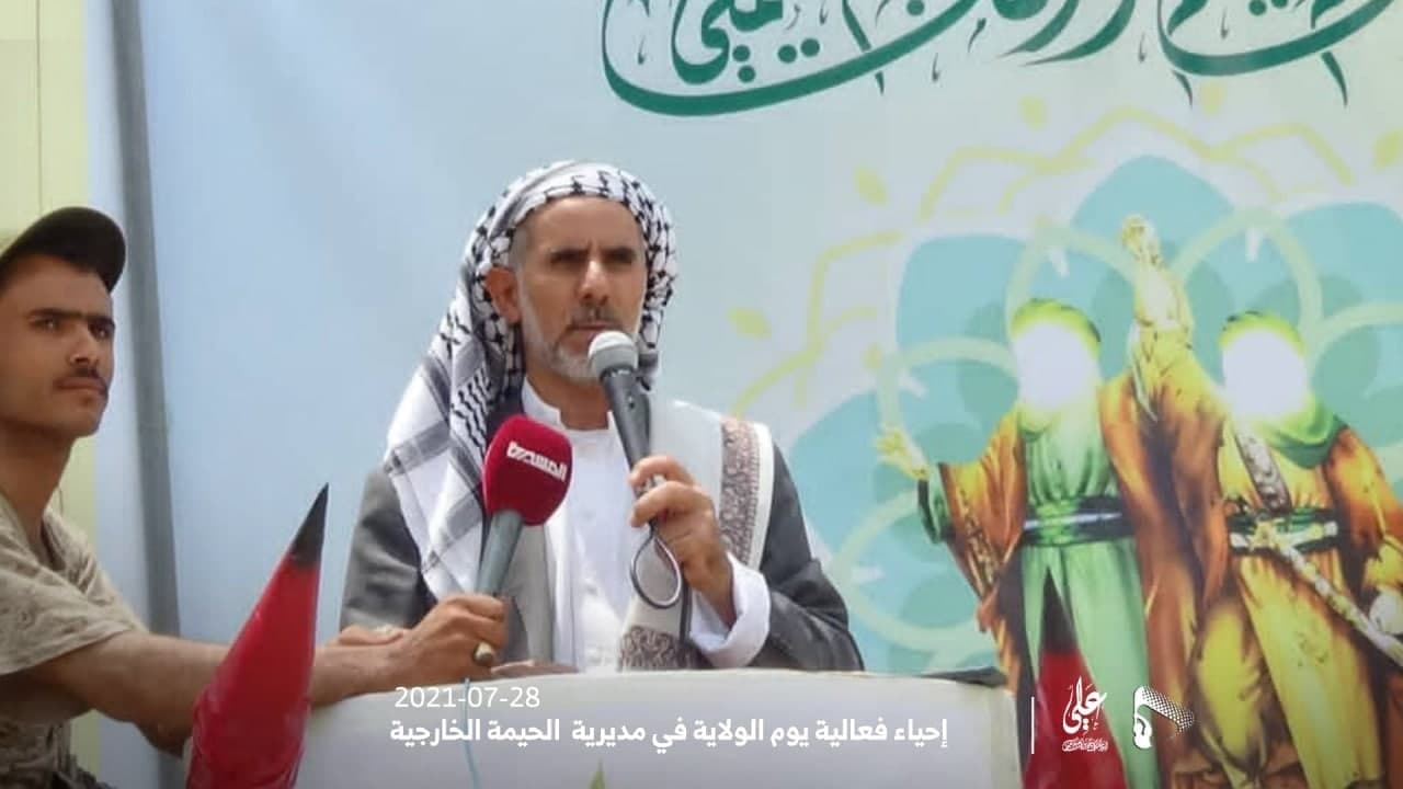وفي المهرجان أشارت كلمات عضو مجلس النواب يحيى القاضي ووكيل المحافظة مانع الأغربي وعضو رابطة علماء اليمن خالد موسى ومدير المديرية راجح الحنمي، إلى الجوانب التاريخية ليوم الولاية ومكانة الإمام ومنزلته العظيمة.