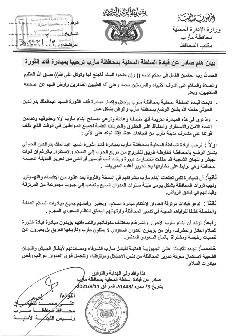 أولاً: ترحب قيادة السلطة المحلية بمحافظة مأرب بمبادرة قائد الثورة السيد عبدالملك بدر الدين الحوثي بشأن الوضع بالمحافظة كخارطة طريق للخروج من مربع الحرب إلى السلام والاستقرار بالرغم أن قوات الجيش واللجان الشعبية قد حققت انتصارات كبيرة وباتت قاب قوسين أو أدنى من تحرير المدينة عاصمة المحافظة وهي ترابط على مشارفها بعد تحرير أغلب المديريات.