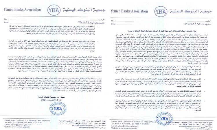 وأكدت جمعية البنوك اليمنية الاحتفاظ بحقها في القيام بما يتيحه لها القانون من فعاليات احتجاجية للرد على تلك التهديدات بما في ذلك الإضراب عن العمل في القطاع والإغلاق الجزئي أو الشامل إن تطلب الأمر ذلك.