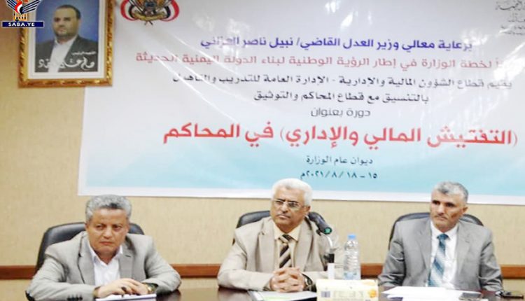 وتهدف الدورة في أربعة أيام بمشاركة 30 مختص من ديوان الوزارة وهيئة التفتيش القضائي وعدد من محاكم الأمانة ومحافظة صنعاء إلى تطوير مهارات الموظفين في مجال المتابعة والتقييم وتوحيد الإجراءات والأساليب الخاصة بآلية التفتيش والمتابعة على المحاكم.