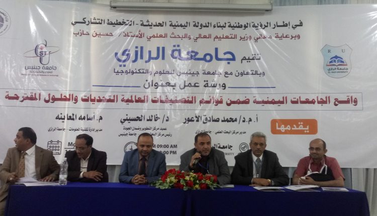 ودعا المشاركون في ختام أعمال ورشة علمية اليوم بجامعة الرازي بصنعاء بالتعاون مع جامعة جينيس للعلوم والتكنولوجيا حول ” واقع الجامعات اليمنية ضمن قوائم التصنيفات العالمية” لانشاء مشروع تصنيف محلي للجامعات اليمنية بإشراف وزارة التعليم العالي.