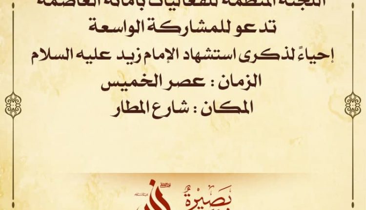 دعت اللجنة المنظمة للفعاليات، إلى المشاركة الواسعة في إحياء ذكرى استشهاد الإمام زيد بن علي عليهما السلام في الساحات المخصصة غد الخميس.