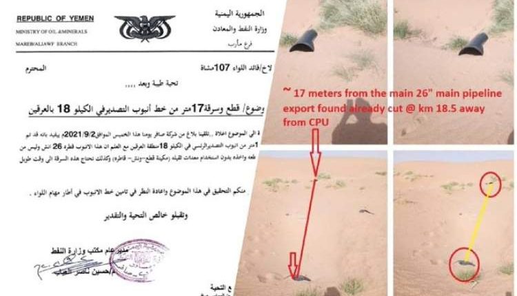 وتكشف الوثيقة الصادرة عن المرتزِق حسين العباب، منتحل صفة مدير عام مكتب وزارة النفط بمدينة مأرب الواقعة تحت سيطرة الاحتلال ومرتزِقته من حزب الإصلاح، عن عملية قطع وسرقة لخط أنبوب نقل وتصدير النفط الخام، من حقول مأرب إلى ميناء رأس عيسى في محافظة الحديدة.