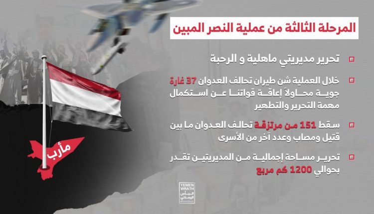 وأهاب البيان، بقبائل مأرب الأبية وأبناء الشعب اليمني، المساهمة في معركة التحرر والاستقلال واستكمال تحرير ما تبقى من المحافظة وكامل تراب الوطن ليكون حراً مستقلاً لا يخضع لأي احتلال أو وصاية.