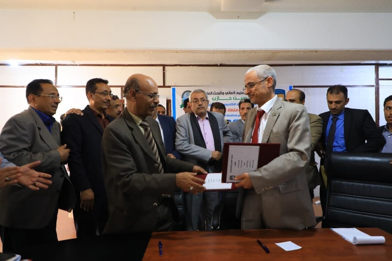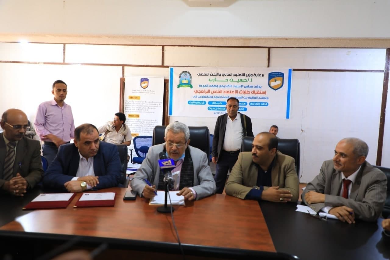 وخلال التسليم، بحضور وزير التعليم العالي والبحث العلمي حسين حازب، ونائبه الدكتور علي شرف الدين، وقع القائم بأعمال رئيس مجلس الاعتماد الدكتور أحمد الهبوب ورئيس الجامعة الدكتور عادل المتوكل، اتفاقية التقدم بطلب كتابي موقع ومعمد من المسئول المخول قانوناً بالجامعة إلى مجلس الاعتماد بشأن بدء تنفيذ الإجراءات للحصول على الاعتماد الخاص للبرامج المذكورة.