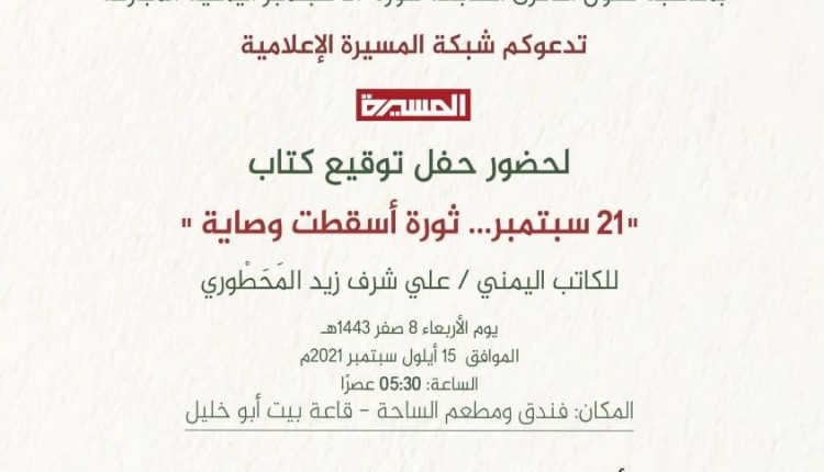 تنظم شبكة المسيرة الإعلامية غدا في بيروت، حفل توقيع كتاب ” 21 سبتمبر…ثورة أسقطت الوصاية” للكاتب علي شرف زيد المحطوري، بمناسبة حلول العيد السابع لثورة 21 سبتمبر.