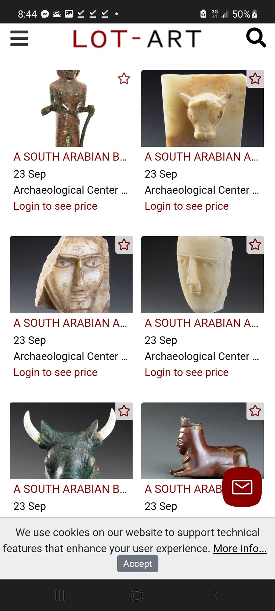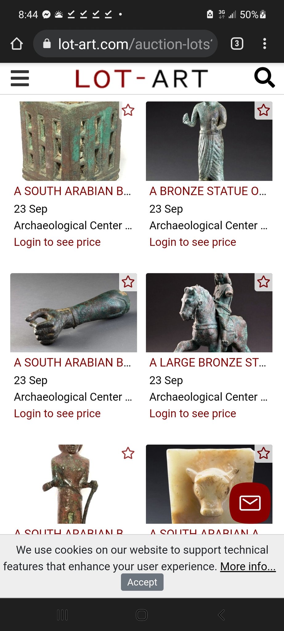 عرض موقع متخصص بالمزادات في كيان العدو الإسرائيلي بيع مجموعة كبيرة من قطع آثار يمنية نادرة وقيمة منهوبة.