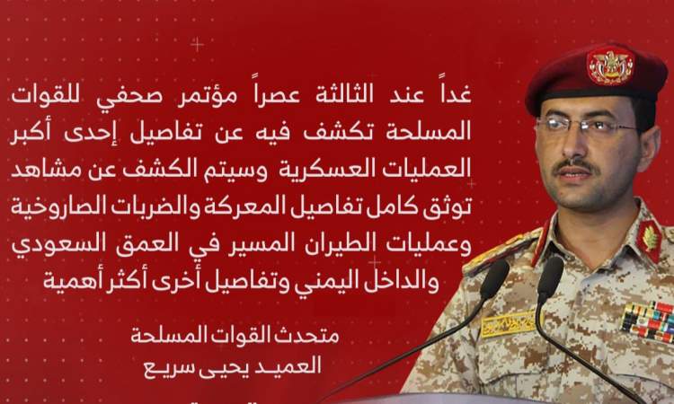 أعلن المتحدث باسم القوات المسلحة اليمنية العميد يحيى سريع، أنه سيتم الكشف عصر الجمعة عن تفاصيل إحدى أكبر العمليات العسكرية والضربات التي استهدفت العمق السعودي والداخل اليمني.
