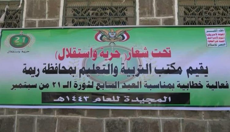 أحيا مكتب التربية والتعليم وأبناء مديرية السلفية بمحافظة ريمة العيد السابع لثورة الـ21 من سبتمبر بفعالتين خطابيتين منفصلتين تحت شعار ” حرية واستقلال”. بحضور رسمي وشعبي كبيرين.