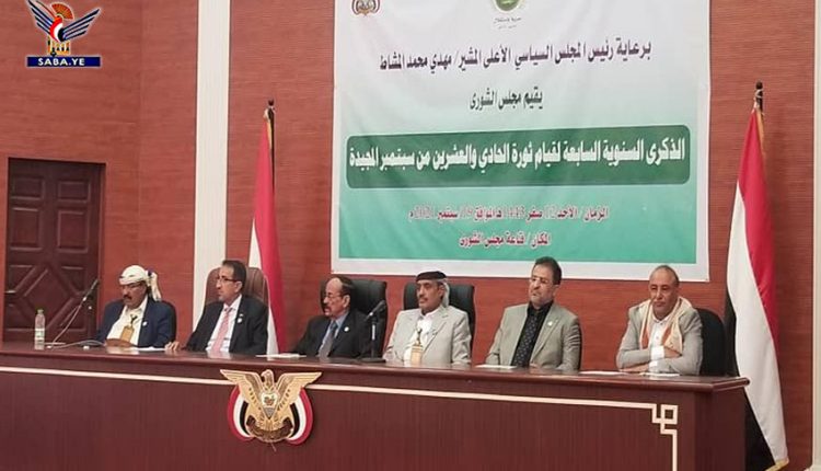 جاء ذلك في فعالية احتفالية نظّمها مجلس الشورى، الأحد، بالعيد السابع لثورة الـ 21 من سبتمبر، بحضور رئيس المجلس محمد حسين العيدروس، ومستشار الرئاسة الدكتور عبد العزيز الترب، ومستشار رئيس المجلس السياسي الأعلى عبد الإله حجر.