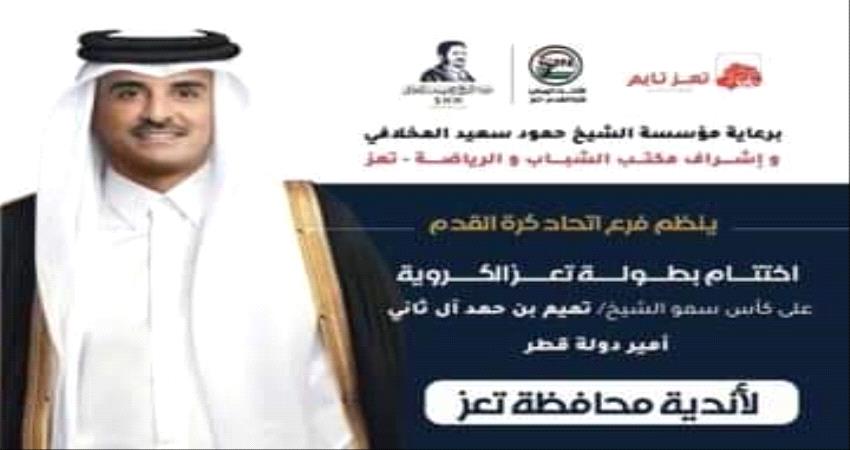 ولفتت المصادر إلى أن البطولة بدأت قبل ثلاثة أسابيع، وطلب القيادي المرتزق في تنظيم الإخوان حمود سعيد المخلافي تغيير اسمها، يوم الخميس، من بطولة تعز الكروية إلى بطولة كأس الأمير تميم بن حمد آل ثاني.