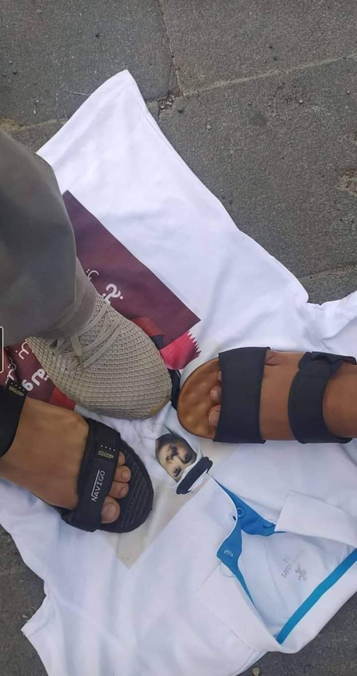 كما داس أبناء محافظة تعز بأقدامهم صورة أمير دولة قطر المطبوعة على ملابس رياضية قامت بطباعتها مؤسسة القيادي الإخواني البارز حمود سعيد المخلافي.