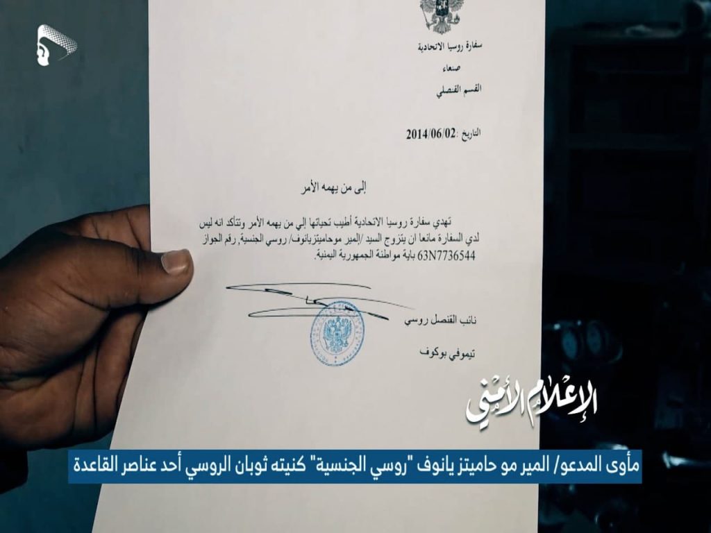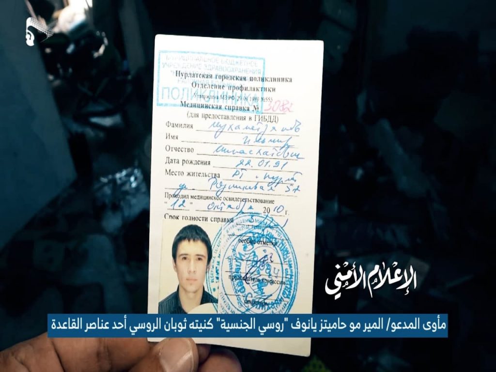 وأوضحت أن أحد قيادات داعش والقاعدة في مديرية الصومعة روسي الجنسية يدعى (المير مو حاميتزيانوف) وكنتيه ثوبان الروسي ويعمل خبيراً في صناعة المتفجرات.