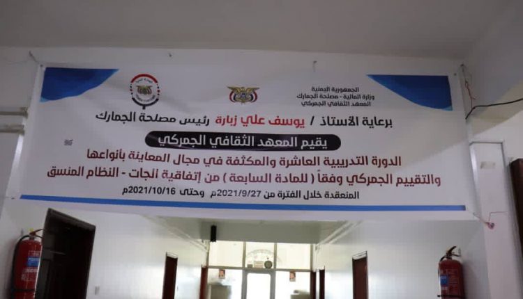 برعاية رئيس مصلحة الجمارك الأستاذ/ يوسف علي زبارة يقيم المعهد الجمركي الدورة التدريبية العاشرة والمكثفه في مجال المعاينة بأنواعها والتقييم الجمركي وفقا للمادة السابعة لاتفاقية الجات وكذلك النظام المنسق، وذلك في المعهد الثقافي الجمركي لعدد 35 متدربا ومتدربة والتي تستمر للفترة من 27سبتمر وحتى 6أكتوبر 2021م ويأتي ذلك استمرارا في برنامج تأهيل وتنمية مهارات الموظف الجمركي وتعزيز قدراته في إطار توجه قيادة المصلحة للارتقاء بمستوى اداء الموظف الجمركي.