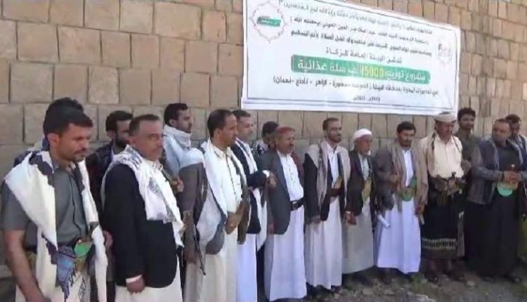 دشن فرع الهيئة العامة للزكاة بمحافظة البيضاء اليوم توزيع خمسة آلاف سلة غذائية للنازحين والفقراء والمتضررين من أبناء مديريات الصومعة ،الزاهر، نعمان، ناطع، مسورة.