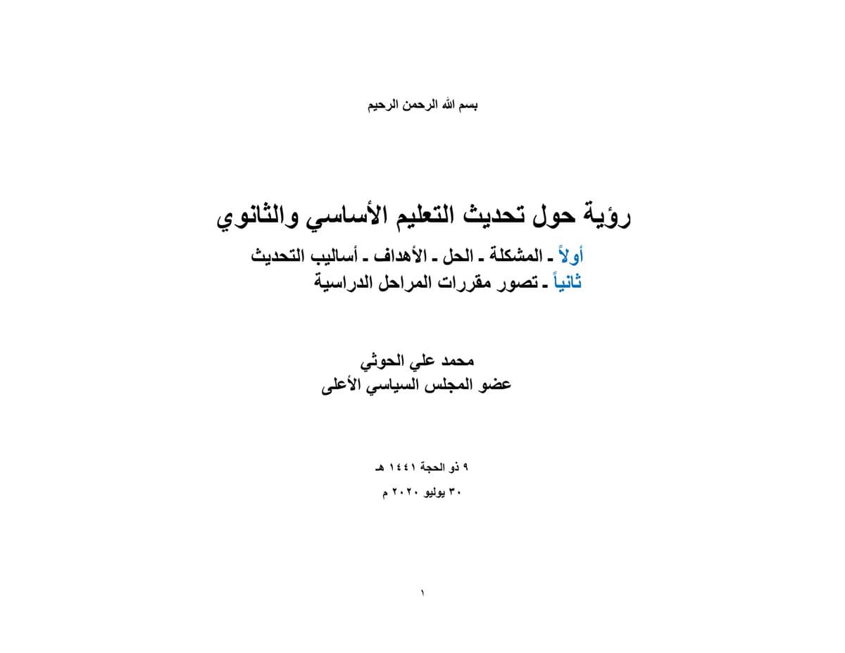 قدم عضو المجلس السياسي الأعلى محمد علي الحوثي، رؤية تهدف إلى تحديث وتطوير التعليم الأساسي والثانوي.