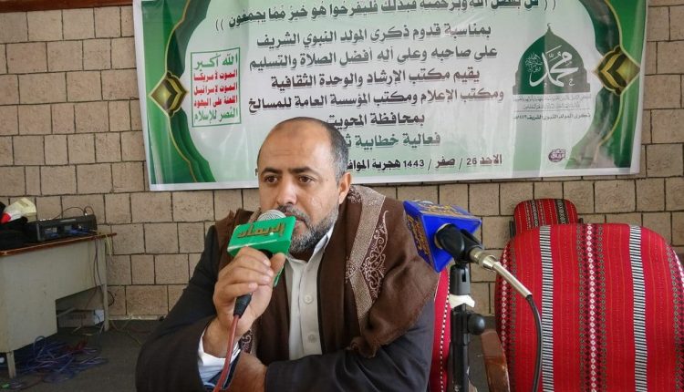 أقام مكتب الإرشاد والوحدة الثقافية ومكتب الإعلام ومكتب المؤسسة العامة للمسالخ بمحافظة المحويت اليوم فعالية خطابية ثقافية, تحت شعار قول الله تعالى قُلْ بِفَضْلِ اللَّهِ وَبِرَحْمَتِهِ فَبِذَٰلِكَ فَلْيَفْرَحُوا هُوَ خَيْرٌ مِّمَّا يَجْمَعُونَ وذلك بمناسبة قدوم ذكرى المولد النبوي الشريف على صاحبه وآله افضل الصلاة والتسليم.