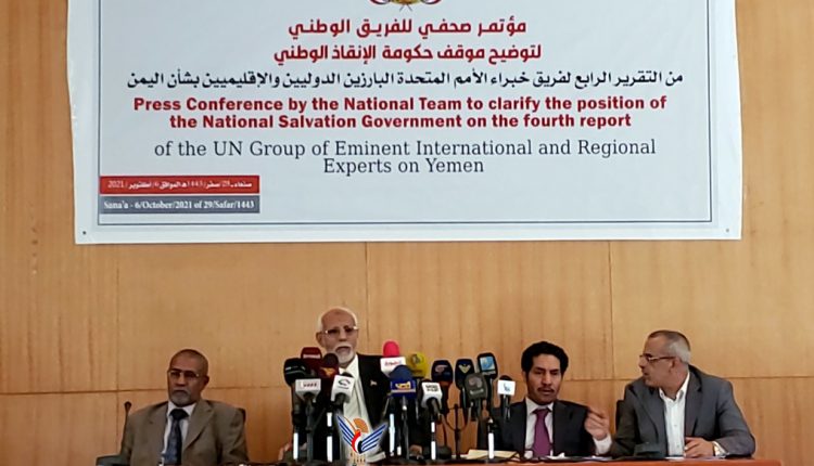 نظم الفريق الوطني المعني بالتعامل مع فريق خبراء الأمم المتحدة الدوليين والإقليميين، الأربعاء، مؤتمرا صحفياً لإيضاح موقف حكومة الإنقاذ الوطني من التقرير الرابع لفريق خبراء الأمم المتحدة البارزين بشأن اليمن.
